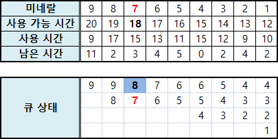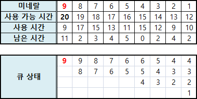 첫 번째의 경우 사용 가능 시간이 20이고, 이때 시간 소모가 9인 미네랄을 충분히 담을 수 있으므로 큐에 넣어줍니다